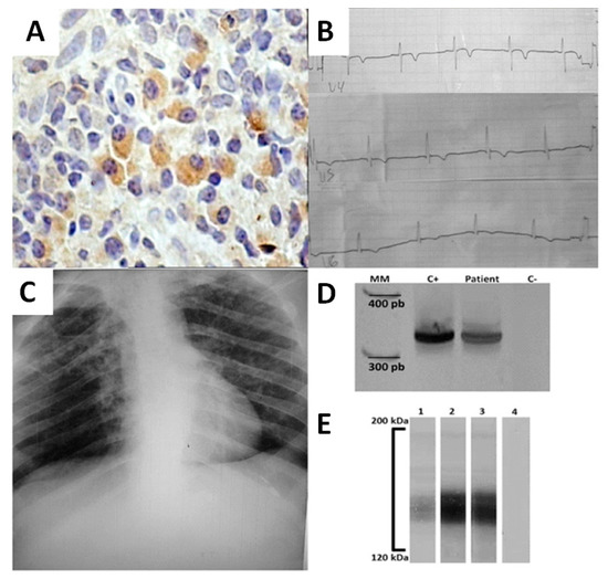 Clinical data and laboratorial findings of a patient with Chagas disease and Leishmaniasis co-infection. (A) Immunohistochemistry for the detection of Leishmania’s antigens in nasal septum biopsy. Brown areas indicate the presence of Leishmania sp. antigens (B) Electrocardiographic alterations showing V4, V5, and V6 derivations with T-wave inversion indicating chronic chagasic cardiopathy. (C) Chest radiography. (D) Molecular detection of T. cruzi DNA using specific primers 121–122 by PCR. Lines MM- 100 bp molecular marker; C+ positive control; patient-patient’s sample; C− negative control. (E) TESA-blot positive for T. cruzi before and after treatment of patient. Lines 1—positive control; 2—patient’s sample before treatment; 3—patient’s sample after treatment; 4—negative control.