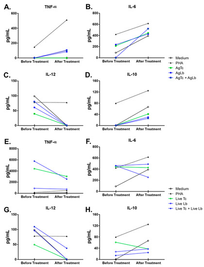 Venous blood was collected in two different time periods: (1) at the moment of patient’s admission, just after clinical evaluation and before any treatment regimen and (2) at the end of specific treatment for mucocutaneous leishmaniasis (40-day period of Glucantime® regimen). In both periods, peripheral blood mononuclear cells (PBMC) were separated using Ficoll-PaqueTM Plus gradient (GE Health Care, Uppsala, Sweden) and cultured in RPMI 1640 (GIBCO, Grand Island, NY, USA) in 8 different culture conditions: medium alone, 2 ug/mL Phytohaemagglutinin (Sigma, St. Louis, MO, USA), 3:1 T cruzi (Y strain) or 3:1 L. braziliensis (Lb2904 strain) live parasites, as well as 5 ug/mL T. cruzi and 5 ug/mL L. braziliensis soluble proteins, in a 5% CO2 atmosphere at 37 ℃ for 24 h, as described elsewhere [11,12]. The supernatants were used for cytokine quantification, IL-6, IL-10, TNF-α and IL-12, by ELISA assay as previously described [11,13]. Briefly, for each cytokine quantification, 96-well flat-bottomed polystyrene microtiter ELISA plates (Costar, Corning, NY) were coated with indicated monoclonal antibody 1 μg/mL (BD Pharmingen, San Diego, CA, USA). Non-reactive sites in the wells were blocked with 2% BSA (bovine serum albumin) in coating buffer. Culture supernatants were added at 100 μL/well and incubated for 2 h at room temperature. Horseradish peroxidase conjugated anti-cytokine monoclonal antibodies (BD Pharmingen, San Diego, CA, USA) were added at 1 μg/mL. After, TMB (tetramethylbenzidine) substrate solution (BD Pharmingen, San Diego, CA, USA) was used for assay revelation, which was read on a microplate reader at 750 nm (Bio-Rad Microplate reader-Benchmark, Hercules, CA, USA), and sample concentrations were determined by simple regression over a standard curve and values were obtained in pg/mL (Figure 2A−D). The results expressed on Figure 2E,H were elaborated considering the equation: