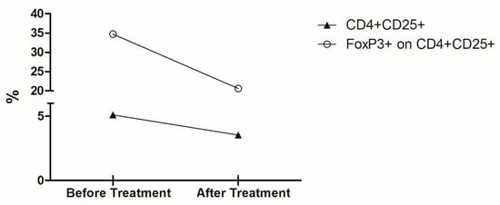 In general, treatment with meglumine antimoniate seemed not to induce changes in TNF-α levels, thus increasing the production of IL-6 and IL-10 and decreasing the levels of IL-12 (Figure 2A−D). The capacity of cells to respond to the various stimuli was also observed when the basal levels were subtracted, considering the cultured cells in medium alone (Figure 2E,H). Before treatment, patient’s peripheral blood cells were stimulated by live parasites, and their soluble proteins or PHA produced higher levels of TNF-α, IL-6, and IL-10 but lower IL-12 cytokines in comparison to culture medium alone (basal production). However, after treatment, there was a remarkable change in the ability of cells to respond to stimuli; this was observed by the down-modulation of TNF-α, IL-6, and IL-10 cytokines but the up-modulation in IL-12 production, which recovered the ability to achieve baseline levels. Cytokine levels were quite often detected at equal or below the amount measured in a medium condition alone. Interestingly, cultured cells still had the ability to produce TNF-α only against live parasites (Live-Tc and Live-Lb) or phytohaemagglutinin (PHA), but not against parasite antigens (Figure 2E). Considering the importance of circulating Treg cells in patients with one of each disease when presented alone [13,14,15], it was decided to evaluate the effect of the meglumine antimoniate treatment over Treg cell counts in this patient, presenting a mixed infection. There was an overall decrease in the number of CD4+CD25High+ T cells as well as in the percentage of Foxp3+ cells within this population after treatment.