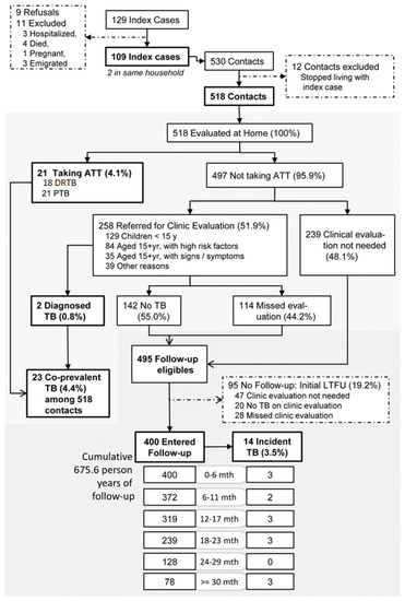 - Shah, N.S.; Yuen, C.M.; Heo, M.; Tolman, A.W.; Becerra, M.C. Yield of Contact Investigations in Households of Patients with Drug-Resistant Tuberculosis: Systematic Review and Meta-Analysis. Clin. Infect. Dis. 2014, 58, 381–391. [Google Scholar] [CrossRef] [PubMed]