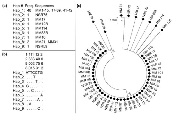 - Librado, P.; Rozas, J. DnaSP v5: A software for comprehensive analysis of DNA polymorphism data. Bioinformatics 2009, 25, 1451–1452. [Google Scholar] [CrossRef] [PubMed]