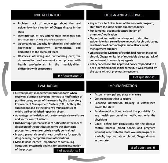 A questionnaire was designed containing a total of 30 questions to obtain relevant information to document the process of creating and implementing a notification policy in Goiás for chronic Chagas cases. The questions were classified into main information groups based on the stages of the public policy formulation cycle model [].
