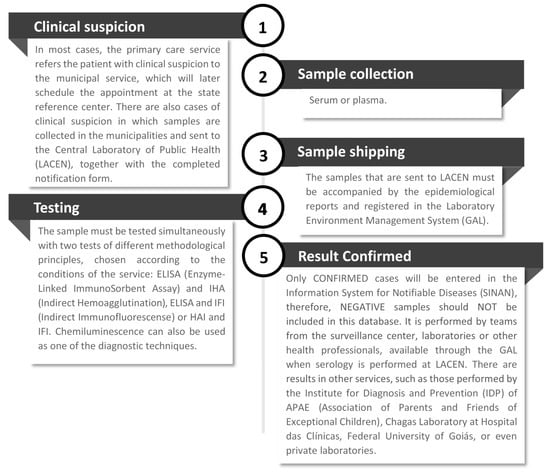 Only confirmed cases are entered into the SINAN (Sistema de Informação de Agravos de Notificação, or Information System for Notifiable Diseases). Therefore, negative samples are not included in this database. The notification is made by the core surveillance teams, by the laboratories or other health professionals, available through the Laboratory Environment Manager when the serology is performed at the Dr. Giovanni Cysneiros State Laboratory of Public Health. There are results in other services, such as those carried out by the Institute of Diagnosis and Prevention (IDP) of the Association of Parents and Friends of Special People (APAE, Associação de Pais e Amigos dos Excepcionais), the Chagas Laboratory at the Hospital of the Federal University of Goiás or even private laboratories.