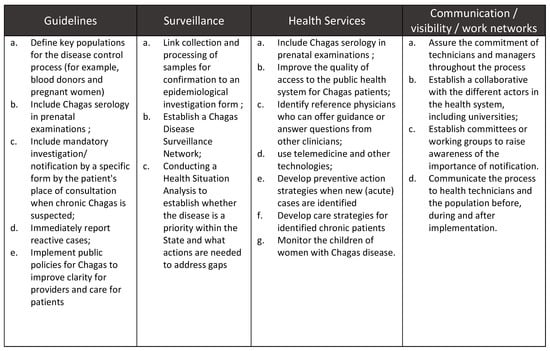 Public policies are the product of the government, but their construction is the result of a complex social interaction with the participation of various actors []. The stages in the design of a policy cycle correspond to a sequence of elements in the political-administrative process. They can be researched concerning its actors, their relationships, their resources, their political and social networks and their practices, typically found in each phase []. The main actors involved in the initiative identified several critical points that defined the initial context of the proposal, justifying the need for intervention. The cycle of neglect is fed by low visibility of people affected in the country, and limited knowledge by professionals and authorities about the disease. This culminates in the failure to report the disease and the lack of interest in preventive or control actions from some professionals and priority technical areas. The identification of chronic Chagas cases in public and private services leads to obtaining a more accurate snapshot of the population needing care, facilitating the implementation of services adapted to the needs of patients and appropriate, timely allocation of resources.