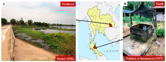 We chose two provinces for our field investigations of environmental Leptospira spp.: Si Sa Ket (SSK) and Nakhon Si Thammarat (NST) provinces, in the northeast and south of Thailand, respectively. Relatively high rates of leptospirosis morbidity have been reported in these regions, according to national disease surveillance data and previous studies [26]. During the field investigation, we recorded key characteristics of water sources and the presence of different animal species around the water source in each of the sampling areas. Figure 1 shows the distinct features of typical water sources used in the northeast and the south of Thailand.