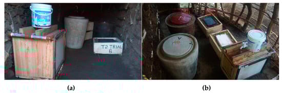 Field testing of the five prototype PCDs, shown in Figure 1, was carried out in Bonchugu village in the Serengeti district. A locally typical house was selected as the venue for testing. The house was divided into two equal compartments, the first a closed area with walls that completely sealed the room (indoor), and the second a porous compartment with open walls (outdoor) as shown in Figure 1. An identical set of prototypes was placed in the indoor and outdoor areas. Each prototype was equipped with a digital temperature data logger (Sensormetrix, London, UK, www.sensormetrix.co.uk) configured to record the temperature inside the prototype at intervals of three hours over a two-week trial period. The data loggers were placed inside the inner units (cooling compartments) of the PCDs. In addition, the peak ambient temperature was recorded each day with another logger placed in the shade outside the trial house. The performance of each PCD was evaluated by comparing the temperature means and ranges of the prototypes. Similarly, the performance of each prototype in the indoor and outdoor areas was compared. Selection criteria for the next phase of the study were the ability of the prototype to maintain storage temperatures below 30 °C with minimal variation, the cost of PCD production, storage capacity, cooling media replenishment frequency and the prototype lifespan. The lifespan of each prototype was estimated by the developers judged from their experience of making similar products.