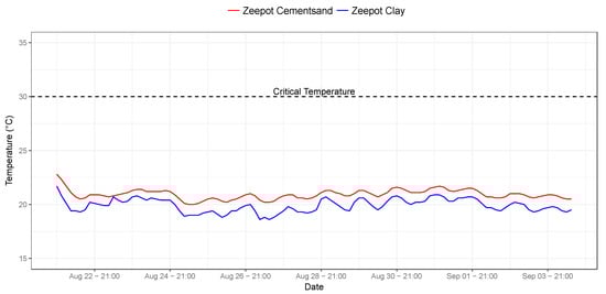 Following these improvements, the second generation of Zeepot Clay and Zeepot Cementsand prototypes were manufactured and subjected to a two-month period of testing. The results from the testing are shown in Figure 3. The Zeepot Clay had a mean internal temperature of 19.9 °C (18.6–21.7 °C, SD = 0.6), whilst the Zeepot Cementsand had a mean internal temperature of 20.9 °C (20−22.8 °C, SD = 0.4). Both Zeepot prototypes maintained internal temperatures below 24 °C, however, because temperatures were consistently lower within the Zeepot Clay, this PCD prototype was selected to proceed to Phase IV (final testing).