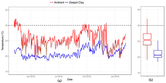 (a) Daily time series and (b) boxplot of ambient (red) and internal temperatures within the Zeepot Clay (blue) over the 12-month testing period in Bonchugu village, Serengeti district. The boxplot indicate median and range of temperatures whereas the dashed line shows maximum storage temperature above which the NobivacTM Canine Rabies vaccine loses potency.
