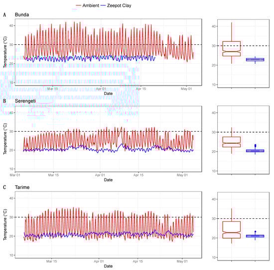 The mean ambient temperature across the three sites was 26.0 °C, with a range of 17.2–43.5 °C, while the mean temperature inside the Zeepot Clay across the three sites was 21.4 °C, with a range of 20.4–22.8 °C. The logger used in the Bunda district stopped recording the temperature inside the Zeepot Clay just before the end of the trial period (Figure 5A). The slight increase in the internal temperature of the Zeepot Clay deployed in Serengeti (Figure 5B) between 7 and 10 April could be because the minimum ambient temperature was considerably higher during this period.