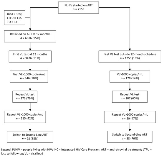 - Pollack, T.M.; Duong, H.T.; Pham, T.T.; Nguyen, T.D.; Libman, H.; Ngo, L.; McMahon, J.H.; Elliott, J.H.; Do, C.D.; Colby, D.J. Routine versus Targeted Viral Load Strategy among Patients Starting Antiretroviral in Hanoi, Vietnam. J. Int. AIDS Soc. 2019, 22, e25258. [Google Scholar] [CrossRef]