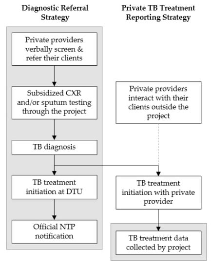 - Khan, A.J.; Khowaja, S.; Khan, F.S.; Qazi, F.; Lotia, I.; Habib, A.; Mohammed, S.; Khan, U.; Amanullah, F.; Hussain, H.; et al. Engaging the private sector to increase tuberculosis case detection: An impact evaluation study. Lancet Infect. Dis. 2012, 12, 608–616. [Google Scholar] [CrossRef]
