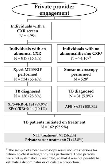 - Creswell, J.; Khowaja, S.; Codlin, A.; Hashmi, R.; Rasheed, E.; Khan, M.; Durab, I.; Mergenthaler, C.; Hussain, O.A.; Khan, F.; et al. An evaluation of systematic tuberculosis screening at private facilities in Karachi, Pakistan. PLoS ONE 2014, 9. [Google Scholar] [CrossRef] [PubMed]
