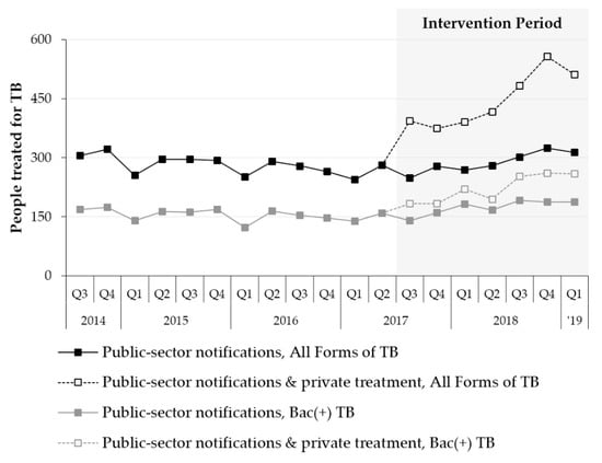 Pre- and post-intervention trends in public-sector TB case notifications and private TB treatment in the study area.
