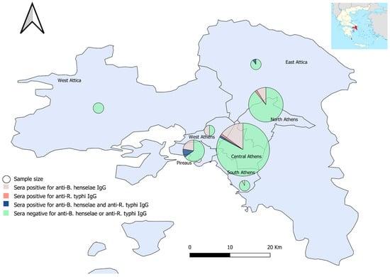 Sera sampling (size proportionate circles) and seropositivity percentages for anti-B. henselae and anti-R. typhi IgG antibodies, per Regional Unit, Attica, Greece.
