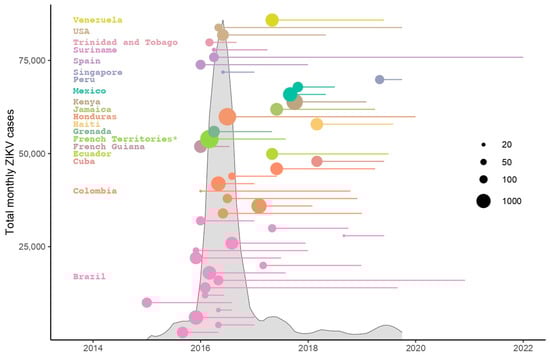 As of August 2020, 52 cohort studies and country-level active surveillance system sites from 28 countries and territories have agreed to contribute de-identified data to the ZIKV IPD Consortium IPD-MA. The use of participant-level data from diverse geographies and populations will allow the team to better identify the clinical, virological, environmental, and individual-level factors that predict severe ZIKV-related fetal effects or adverse neurocognitive or neurodevelopmental outcomes in the child, several of which can only be measured after two years of age [10]. For example, the diversity of populations will help researchers understand differences in the sequelae of fetal exposure between populations with a high prevalence of recent prior exposure to other arboviruses and those where ZIKV occurs alone, while accounting for yellow fever immunization. Figure 1 shows the distribution of ZIKV cases at the global level, extracted from the PAHO PLISA Health Information Platform for the Americas [11]. Each circle represents a longitudinal study or country-level active surveillance system with circle size corresponding to the number of pregnant women enrolled and the line indicating the time period during which studies recruited pregnant women. As indicated in the graph, the number of new ZIKV cases has decreased dramatically since 2018, and several of the larger studies began towards the end of the epidemic in the Americas. Utilizing available data will be especially important since few studies have been able to secure funding for the follow-up needed to understand the spectrum and incidence of longer-term consequences of fetal exposure to ZIKV.