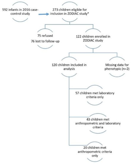 Figure 1 describes the children included in our analysis. Of the 592 children in the case-control study, 273 children were eligible for the ZODIAC investigation. Of these eligible children, 151 were unavailable for follow-up (75 refused, 76 lost to follow-up), and two were missing phenotype data (see phenotype classifications below), which left 120 children for our analysis. Of the 120 children, 20 met anthropometric eligibility criteria only, 43 met anthropometric and laboratory criteria, and 57 met laboratory criteria only.