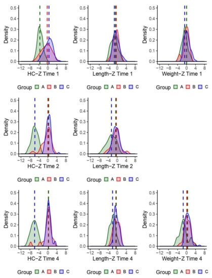 Density plots of observed children’s head circumferences (HC), length, and weight z-scores. Time 1: birth; time 2: age 1−7 months; time 4: age approximately 24 months. Group phenotype: A = Zika-specific, B = nonspecific dysmorphic, and C = nondysmorphic.