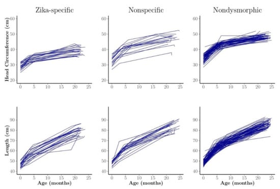 Investigators have noted that congenital Zika infection affects infant growth, especially head circumference (HC), and have observed variability in degree and timing of HC changes as an indicator that an infant has been infected [9,10,11,12,13]. Some research suggests that congenital Zika infection may affect body length [12,13], although Walker et al. [20] describe a femur-sparing pattern of abnormal fetal growth associated with maternal Zika virus infection. There is evidence that congenital infections with other neurotropic viruses affect growth (e.g., HC, length, weight), and that these early growth parameters are predictive of cognitive impairment later in childhood [21,22] However, to inform monitoring and care of infants born during and following future Zika virus outbreaks, research could help to determine if early growth patterns might be useful as predictors of later functional deficits.