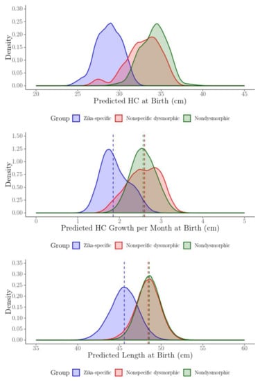 Posterior density plots for the predicted HC and length at birth, and predicted HC growth rate per month at birth for each child by phenotype group, are presented in Figure 5. Results illustrate the posterior density plots for the Zika-specific phenotype group are shifted downward for the HC and length at birth, and the HC growth per month at birth is smaller compared to the nonspecific dysmorphic and nondysmorphic groups.