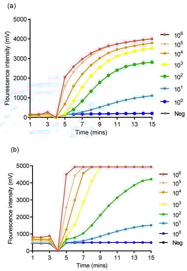 - Becherer, L.; Bakheit, M.; Frischmann, S.; Stinco, S.; Borst, N.; Zengerle, R.; Von Stetten, F. Simplified Real-Time Multiplex Detection of Loop-Mediated Isothermal Amplification Using Novel Mediator Displacement Probes with Universal Reporters. Anal. Chem. 2018, 90, 4741–4748. [Google Scholar] [CrossRef] [PubMed]