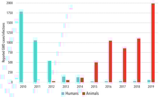 - Callaway, E. Dogs thwart effort to eradicate Guinea worm. Nature 2016, 529, 10–11. [Google Scholar] [CrossRef]