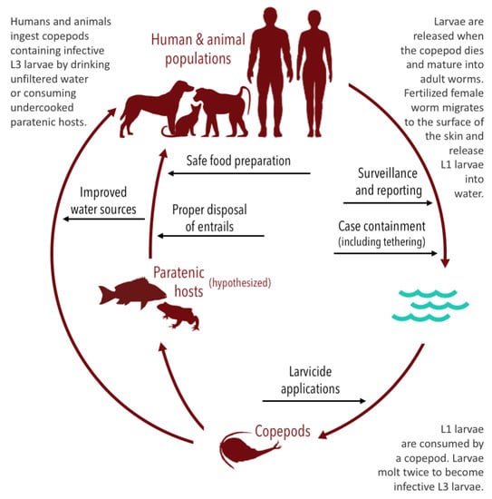 - Galán-Puchades, M.T. Dracunculiasis: Water-borne anthroponosis vs. food-borne zoonosis. J. Helminthol. 2019, 94. [Google Scholar] [CrossRef] [PubMed]