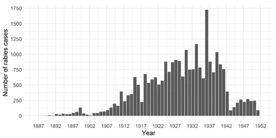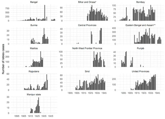 CVD reports also highlight the wide variation in numbers of rabies cases reported from various provinces (Figure 2). In line with the lack of a consistent policy for rabies control in animals, there was little consistency in reporting of animal rabies cases []. Statistics compiled by Chakarabarti (2012) show that between 1880 and 1935 rabies caused an average of 160–170 human deaths per year in Punjab province []. However, the few animal rabies cases that are reported from Punjab province appear during the late 1800s and early 1900s, following which cases are reported only sporadically (Figure 2). It was often acknowledged that reported statistics of animal rabies incidence were likely to be underestimates of the true disease burden [,], which was sometimes attributed to a lack of public interest in reporting cases to veterinary officials []. There is a marked drop in the number of recorded animal rabies cases after 1941 (Figure 1), possibly because many provinces stopped reporting cases after this period (Figure 2).
