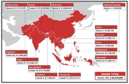 The Stop TB Partnership’s TB REACH initiative [17] was established in 2009 to bring new ideas and thinking to promote bold action in the fight against TB. With foundational support from Global Affairs Canada, and additional support from USAID and The Bill and Melinda Gates Foundation, TB REACH provides rapid funding to partners to quickly implement case finding and treatment support interventions whilst conducting continuous monitoring and evaluation. Despite a focus on service delivery, each TB REACH project is given strong independent monitoring and evaluation support to track historical and prospective TB notification data as well as intervention specific indicators, so results are rigorously documented. TB REACH works with innovators and grassroots organizations, testing new approaches and technologies that many traditional donors, are less inclined to support. With eight waves of funding, TB REACH has provided USD 63.4 million to countries in the Asia-Pacific region through 134 grants (Figure 1).