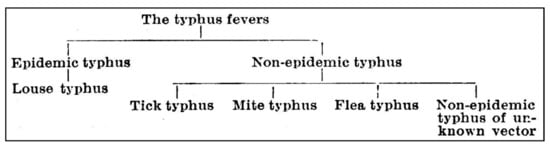 The work by Fletcher and Lewthwaite and many others at the Institute for Medical Research (IMR) in Kuala Lumpur triggered numerous reports from around the world describing diseases, which, while resembling epidemic typhus, were milder diseases that occurred sporadically. In the British colonies within the AAP, expatriate military personnel, especially in India (Sir John Megaw) and the Malay states (Dr. William Fletcher), encountered a vast array of “tropical fevers” [38,42,43,44]. Although endemic typhus-like illnesses were reported from various countries, little attention was shown to the sporadic typhus fevers (as compared with the epidemic typhus fevers). Working in India, Sir John Megaw, United Kingdom medical adviser to the India Office, responded to the “storm” of names for these diseases and the confusion of vectors, agents, and geographical regions by proposing in 1924 a new classification based on the vectors of different typhus forms (Figure 1) [44]. He distinguished between “epidemic” and “non-epidemic” typhus, and the old-world understanding of “typhus and unclassed fevers” was transformed into “the typhus group of fevers” [44]. Initially, this included the subgroups louse typhus, “tick-“, “mite-“, and “flea-typhus” [45], but with new cases of typhus in India, a new entity of “unknown vector-transmitted typhus” was added to the scheme in 1934 [46].