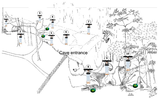 Potential breeding sites were explored using modified emergence traps [17]. The traps were positioned in 18 locations, including ten inside the cave and eight outside the cave (around the cave shelters and under the tree shades), with a distance of about 10–15 m from each other, covering suitable areas for breeding sites. Among the ten traps inside the cave, two of them were placed near the entrance in the photic area of the cave, while the remaining eight were placed in the aphotic area of the cave (15–20 m from the cave entrance). Each modified emergence trap was prepared using a tray 15 × 45 cm in dimension, with a plastic funnel 6 cm in diameter placed on top. The narrow end of the funnel ends in a closed transparent cylindrical container with the size of 7 × 8 cm in dimension (Figure 2). Adult sandflies were expected to emerge at the transparent container on top of the funnel.