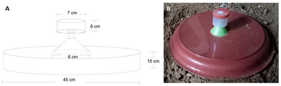 Modified emergence trap to determine potential breeding sites. (A) The schematic design of the modified emergence trap consisted of a tray, a plastic funnel, and a closed transparent container on top. (B) The modified emergence trap used in this study. They were placed to cover suspected breeding sites.