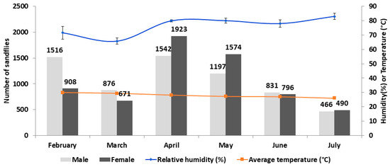 Monthly number of collected sandflies. The monthly number of male (grey bars) and female (black bars) sandflies is presented with the relative humidity (blue line) and average temperature (red line).
