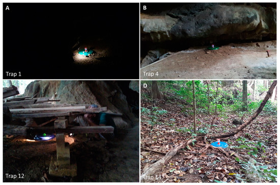 Sandfly resting or potential breeding sites around the cave area. Resting sites and potential breeding sites were found inside in the aphotic area of the cave (A), near the cave entrance (B), and outside the cave under the wood piles and tree shades (C,D), respectively.