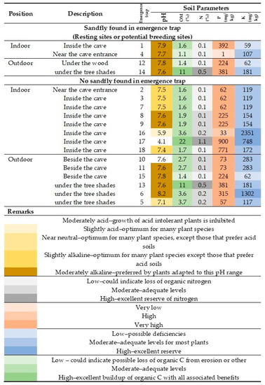 The soil quality had moderately alkaline pH, moderate-to-high macronutrients, and low-to-high organic matters. Slightly to moderately alkaline soil pH has been shown to provide optimal growth of the microenvironment. Thus, this condition might provide a supply of micronutrients for the nourishments of the sandfly larvae, thus promoting their development [38]. Aside from the potassium levels, there were no significant differences between soil parameters taken from sites near the positive and negative traps. There were also no differences in soil quality taken from inside or outside the cave.
