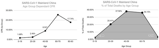 Age group dependent CFR (left column) as compared to % of total deaths for various age groups (right column) mortality (left column) for SARS-CoV-1 in Mainland China. Showing how CFR is much higher for advanced age while the majority of deaths occurred in younger populations exposed to the virus in both the community and hospitals [].