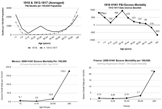 Mortality visualizations for H1N1 pandemics of both 1918–1919 and 2009. Averaged mortality (upper left) as compared to excess mortality (upper right) due to 1918 H1N1 pneumonia and influenza (P&I) pandemic. Excess death rates [] are shown for the 2009 H1N1 pandemic for both the country of Mexico (lower left) [] and France (lower right) [].
