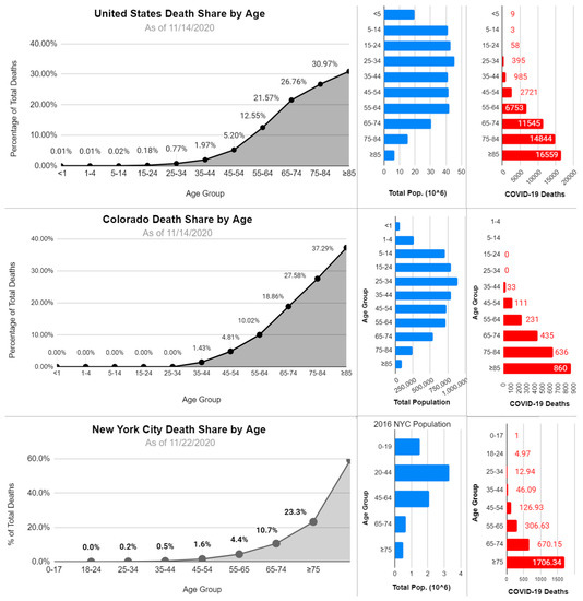 Deaths based on three regions for SARS-CoV-2, data included was last updated between 14 November–22 November 2020. The top row shows the percentage of total SARS-CoV-2 deaths (left column), regional demographics (middle column), and the total number of deaths (right column) for the United States, Colorado, and New York City. This serves to show how regional demographics can influence total death share data and can change noticeably throughout different regions. For the United States and Colorado, data were compiled from the CDC Provisional COVID-19 Data Sets []. For New York City, the city government’s data set was used [].