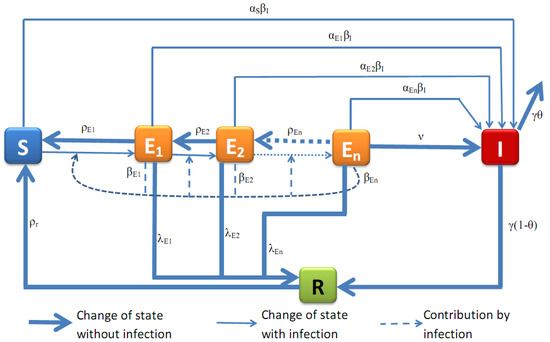 We denote by S the number of humans who have not had any contact with the virus. The compartment E is subdivided into several sub-compartments, , that represent the different levels of asymptomatic transmission. We assume that the force of transmission gets larger as the index , increases; that is the probability of a successful infection after contact of humans of type with humans of type I is higher as i increases. We also assume that there exists , such that does not progress to higher levels of infectiousness (, say) whenever . This accounts for the load of pathogens in the body that could be considered mild and unable to cause more harm. We denote by I the number of infected humans who show clinical signs of the disease, and by R the number of humans who recover from the disease.