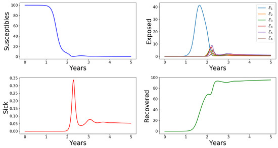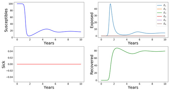 The initial conditions (9) state that the infectious case occurs in the asymptomatic class , which can naturally advance to the next higher level infectious class , which can advance to , which can advance to , which can advance to , which in turn can advance to I. Figure 4 shows that there is a delay in the dynamics of each infectious class, including the sick and the recovered humans. In fact, the variables s, , I and R all remain very low for a minimum of approximately 1 year, then they increase sharply to their respective maximum values in a sequential order, before the decrease dramatically and stabilize at non-zero values (persistence). Similar results are obtained when the first infection case occurs in other higher level infectious classes, with the disease spreading to all other infectious classes. In this case of initial conditions (9), the outbreak relative severity .