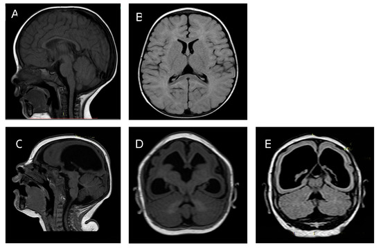 Twin A: Panel A: Brain MRI at 7 months of age sagittal T1 showing normal brain cortex formation and thickness, normal corpus callosum, and posterior fossa. Panel B: Axial T2 Fluid Attenuated Inversion Recovery (FLAIR) showing normal ventricular size. Twin B: Panel C: Brain MRI at 7 months sagittal T1. Panel D axial T2 FLAIR. Panel E axial T1. Images show a thin cortical mantle, ex vacuo enlargement of lateral ventricles, reduced cortical folds, and hypogenesis of the corpus callosum.