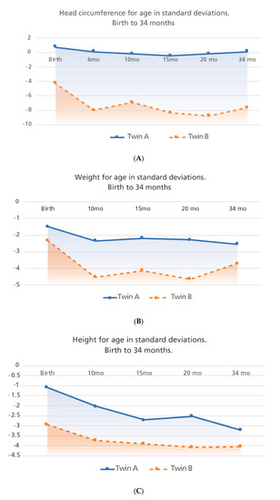 Growth trajectories for both twins taken at five time-points are shown. Panel A: head circumference for age, Panel B: weight for age and Panel C: height for age. Birth measurements were analyzed with Intergrowth 21st newborn growth standards comparing the measurement with gestational age (GA) and sex; other measurements were analyzed with the World Health Organization (WHO) growth standards comparing measurements with chronological age and sex.