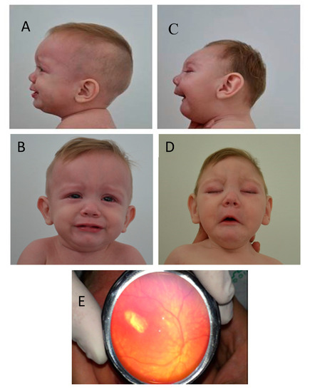During Twin B’s last evaluation at 34 months of age, his mother reported persistent epilepsy and abnormal movements consistent with tremors. He had swallowing difficulties but was able to be fed thickened liquids by mouth. His anthropometry showed an HC of 38.5 cm (−7.67 SD, < rd percentile), weight of 8.96 kg (−3.72 SD, <3rd percentile), and height of 81.1 cm (−4.04 SD, <3rd percentile), consistent with persistent severe microcephaly with a general compromise of somatic growth (Figure 2). On physical examination, he had microcephaly, craniofacial disproportion due to a small cranial vault, a non-palpable anterior fontanelle, a sloped forehead, straight palpebral fissures, anteverted nostrils, thin lips, and micro-retrognathia (Figure 3 panels C and D). His ears were low-set and posteriorly rotated; no other morphological abnormalities were documented. Neurological examination detected poor head control, with neck and truncal hypotonia and limb spasticity; he maintained an abnormal posture with hyperflexion of his upper extremities and hyperextension of his lower extremities. He had persistent suck and Moro reflexes and symmetrically brisk deep tendon reflexes. He had severe motor and language delay. The ophthalmological evaluation reported failure to fix and follow visual stimuli, and the indirect ophthalmoscopy reported signs of torpedo maculopathy and retinal scar of the left eye, unchanged from previous evaluations (Figure 3 panel E).