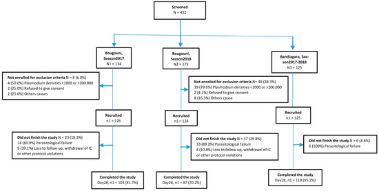 Sample size calculations: Previous studies in Mali found artemether-lumefantrine efficacy of at least 95% in the different research sites [24,25]. The sample size calculations were based on WHO methodologies [26] using a slightly more conservative expected efficiency estimate (95%) and a precision level of about 5%. To achieve this, and with a projected loss of follow-up rate of 20% by day 28, a minimum of 117 patients should be recruited, rounded to 120 subjects on each of the study sites.