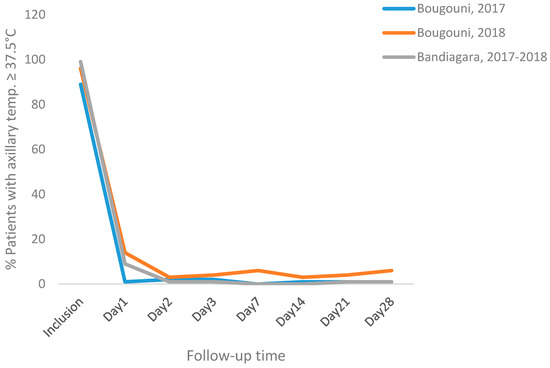 Proportion of patients with axillary temperature ≥37.5 °C in both sites during the 28-day follow-up.