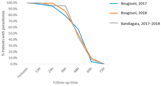 We also used a parasite clearance estimator from The Worldwide Antimalarial Resistance Network (WWARN) [27]. The estimated time in hours to reduce parasitemia by 99% of its initial value was 21.0 h for Bandiagara, 26.9 and 32.3 h for Bougouni in 2018 and 2017, respectively (Figure 4).