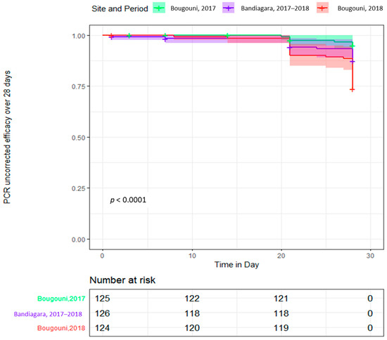 The WHO indicated Kaplan–Meier survival analysis [26] assessing the uncorrected treatment efficacy showed a significant difference (p < 0.0001) between the study sites (Figure 5).