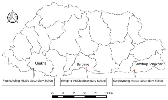 Map of Bhutan showing the location of three schools in which the study was conducted (Bhutan is located between China in the north and India in the south, east, and west). The names and borders of the districts are indicated as well as the location of the schools surveyed (red dots). The map was prepared using Quantum GIS, QGIS Development Team (2019), QGIS Geographic Information System, Open-Source Geospatial Foundation Project (http://qgis.osgeo.org) and was not taken from another source.