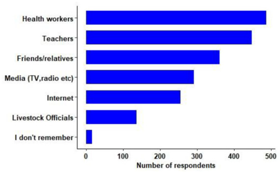 Most students had heard about rabies (n = 688, 98.2%). The sources of information (Figure 2) were from health workers (n = 488, 70.9%), teachers (n = 449, 65.3%) and friends (n = 362, 52.6%). Among those who had heard about rabies, the majority (n = 622, 90.4%) knew that dog is the main source of rabies in Bhutan. However, few students mentioned that other animals, such as bats (n = 36, 5.2%), cats (n = 3, 0.4%), cows (n = 1, 0.1%) and birds (n = 2, 0.3%), are the main source of rabies.