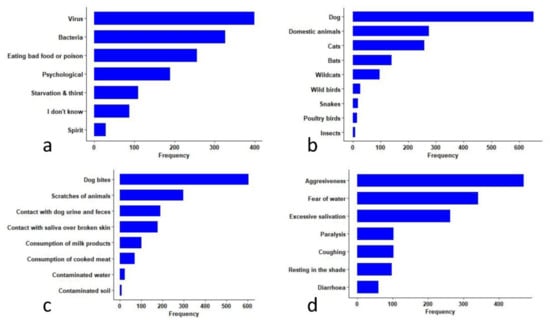Knowledge on rabies among the students from study areas in South Bhutan: (a) knowledge on causes of rabies mentioned by the students; (b) knowledge on the susceptible hosts of rabies mentioned by the students; (c), knowledge on the mode of transmission of rabies mentioned by the students; and (d) knowledge on the clinical signs of rabies mentioned by the students. Each bar in the graph represents frequency of the positive responses by total students who heard about rabies (n = 688) to the specific cause, hosts, routes, and clinical signs of rabies.