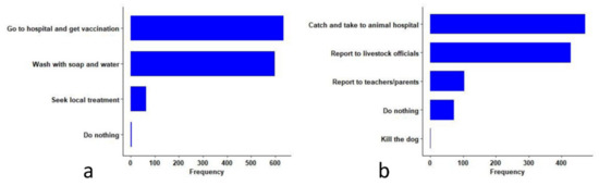 Students’ perceptions on rabies: (a) what they would do if they were bitten by a rabid dog; (b) what they would do if they saw rabid dog in the streets. Each bar in the graph represents frequency of the positive responses by total students who heard about rabies (n = 688) to the specific cause, hosts, routes, and clinical signs of rabies.